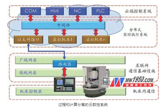 智能工廠的數(shù)控機(jī)床和機(jī)器人等智能裝備的未來發(fā)展重點(diǎn)已經(jīng)不在硬件,感知外部環(huán)境和工況變化需要更加強(qiáng)大的計(jì)算能力、通信帶寬和速度,才能進(jìn)行實(shí)時(shí)控制,形成真正的信息物理融合系統(tǒng)。它的特點(diǎn)是將設(shè)備的控制分為計(jì)算和過程兩部分,把運(yùn)動(dòng)控制保留在本地,而將計(jì)算移到云端,在云端“克隆”相應(yīng)的虛擬設(shè)備,在云端進(jìn)行虛擬制造,如圖所示。