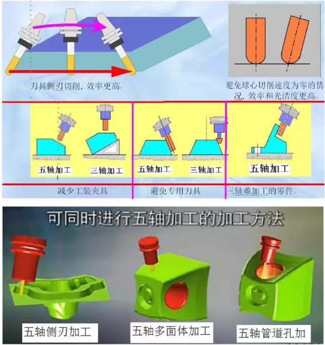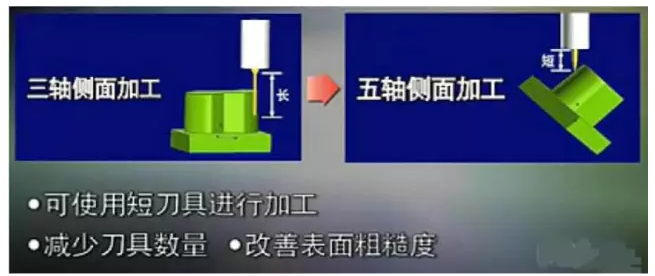 與三軸聯(lián)動(dòng)的數(shù)控加工相比,從工藝和編程的角度來看,對(duì)復(fù)雜曲面采用五軸數(shù)控加工有以下優(yōu)點(diǎn):
