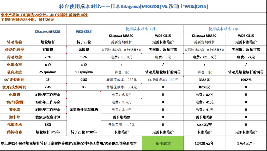 汽車配件行業(yè)一位客戶在試用沃迪士WDS-C315型號(hào)時(shí)將沃迪士第四軸產(chǎn)品與其原有的日本北川Kitagawa MR320R型號(hào)性能進(jìn)行了跟蹤和記錄,測(cè)試詳細(xì)結(jié)果如下表。沃迪士數(shù)控回轉(zhuǎn)臺(tái)以其獨(dú)特的滾子凸輪結(jié)構(gòu)在轉(zhuǎn)速、傳動(dòng)效率和維護(hù)成本上展現(xiàn)了明顯的優(yōu)勢(shì)。
